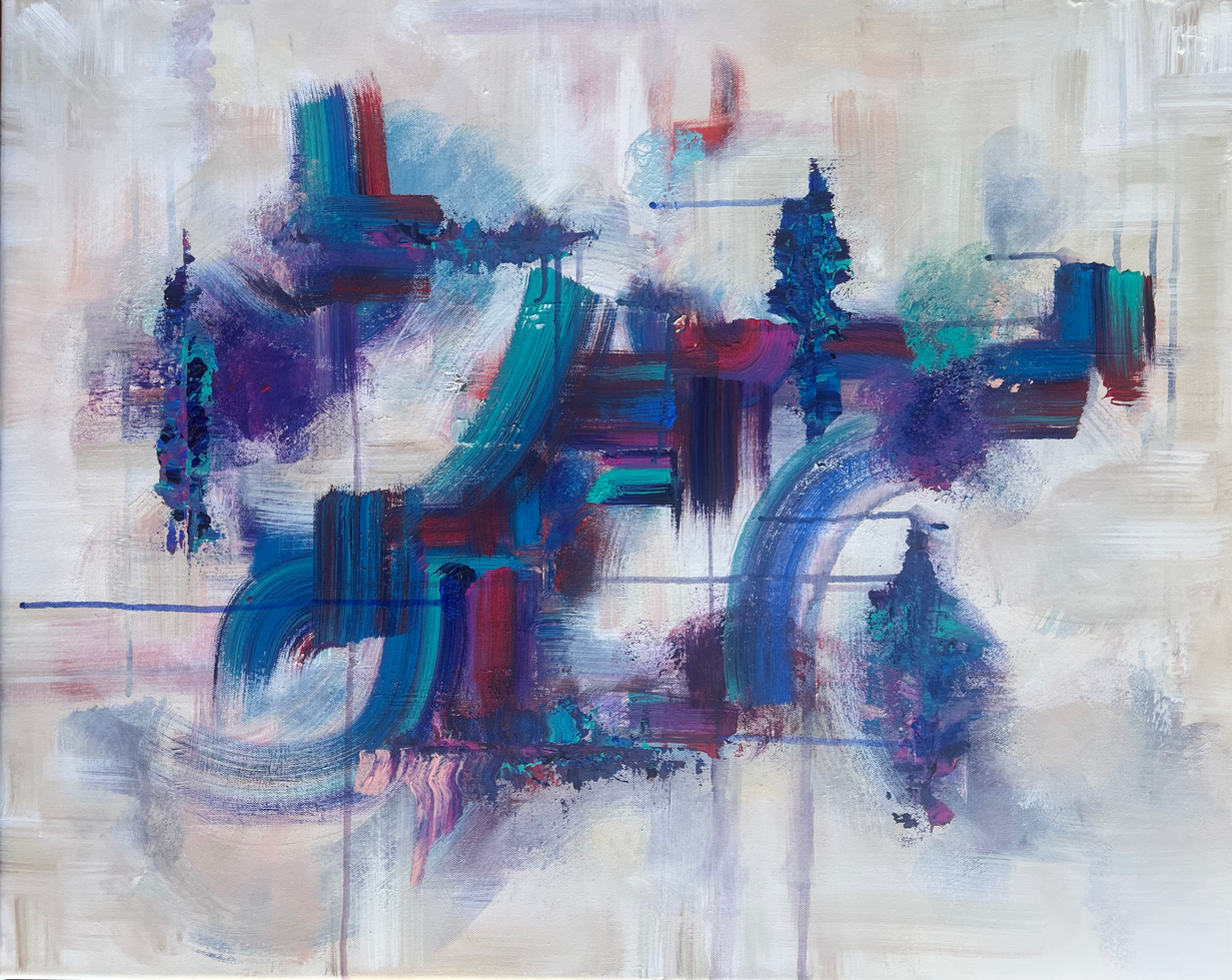 Something New is an exploration of beginnings and the quiet shift that happens when familiarity gives way to possibility. Layers of soft neutrals create a sense of openness and pause, while confident strokes of deep blues, teals, and hints of burgundy move across the canvas like intersecting paths. Every brushstroke and color decision was deliberate and represents both the uncertainty and excitement of change.