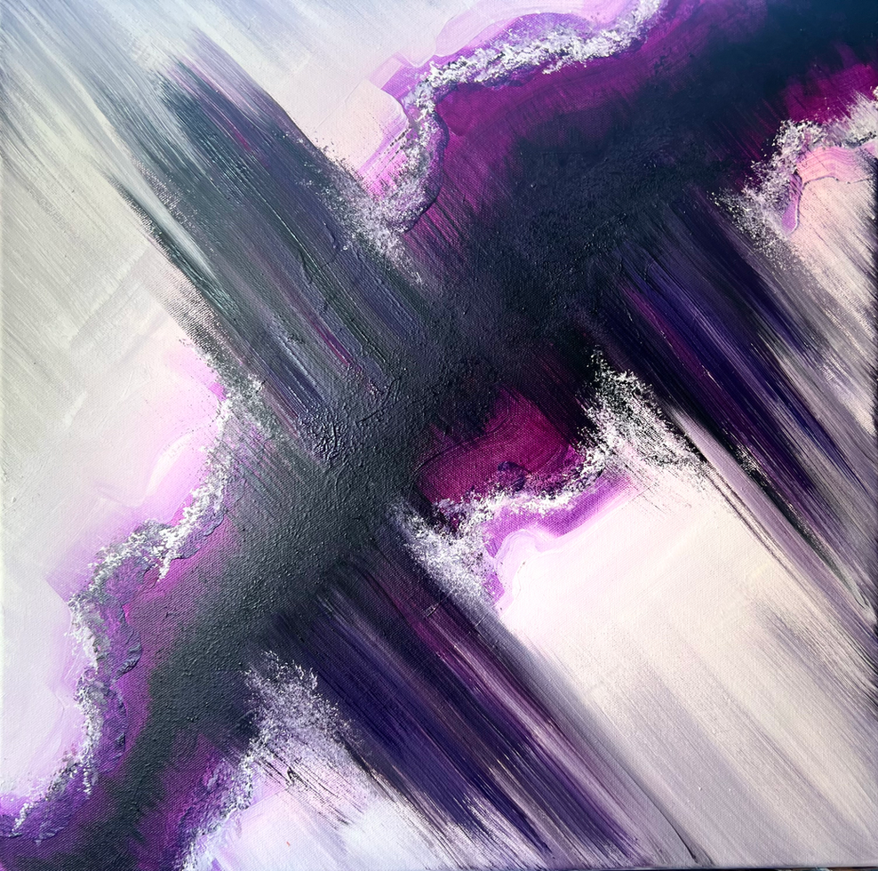 This piece represents denial, the surreal and disorienting first stage of grief the artist experienced after the loss of her father. Shades of purple move through the canvas in fragmented layers, reflecting the emotional numbness and disbelief that followed his passing—the feeling of life continuing while her reality felt suspended. The softened edges and blurred transitions mirror moments when the loss felt unreal, as if acceptance could be delayed by not fully acknowledging it. Fleeting breaks in texture hint at truth pressing through, only to be pushed aside again. This work captures the artist’s attempt to survive the initial shock of grief while her mind struggled to reconcile absence with memory.